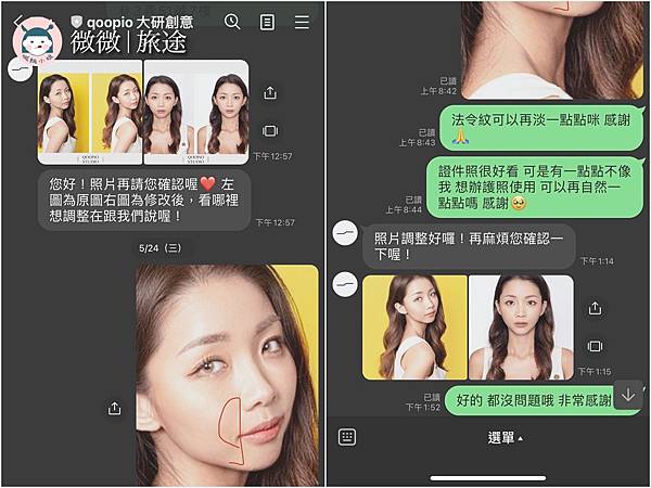 拍攝時會拍攝很多張不同的動作,最後挑選一張修圖,隔天Line就會收到修圖前後的對比圖,可以直接溝通,做出調整哦~