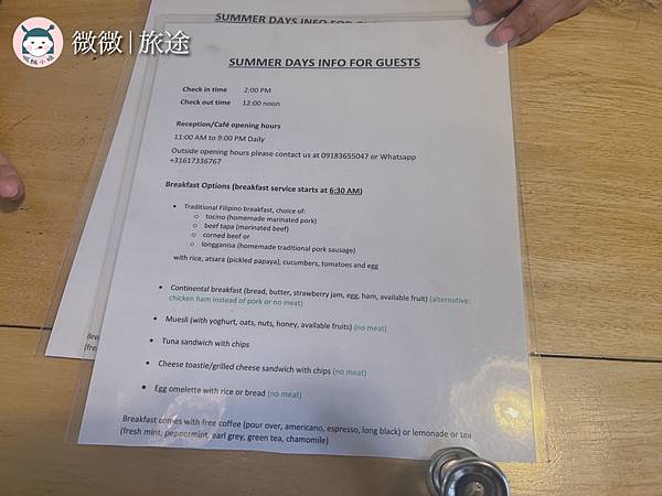 入住會有一些基本的資訊,前台並不是二十四小時的哦。當初選這家就是想吃吃看咖啡廳級規格的早餐呀~有六種選擇很豐富。住宿的位置離機場大約十五分鐘以內的距離,可以代訂機場接送服務400披索,但因為我們要離開的時候剛好沒有辦法遇到預定到,所以店家幫我們預約了計程車是350披索囉。