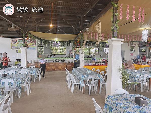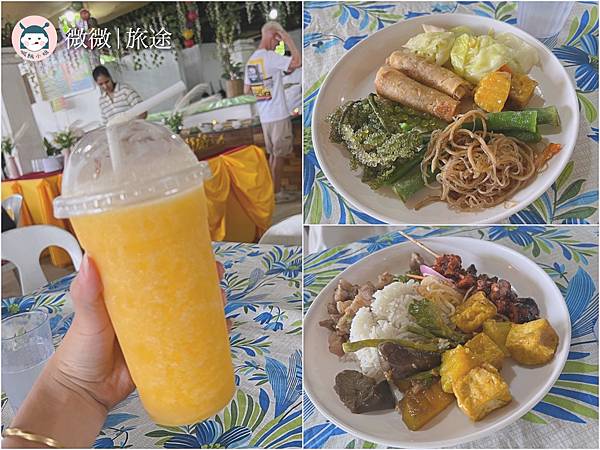 旁邊有很多果汁攤,我們再去餐廳前的路上小巴導遊有停下來,讓大家先點,會直接送到餐廳150披索/杯哦,我們點芒果的還蠻好喝的,午餐還有海葡萄菜色,味道跟這幾天吃到的菲式菜色差不多,BBQ醬跟稍微會偏乾一點點。