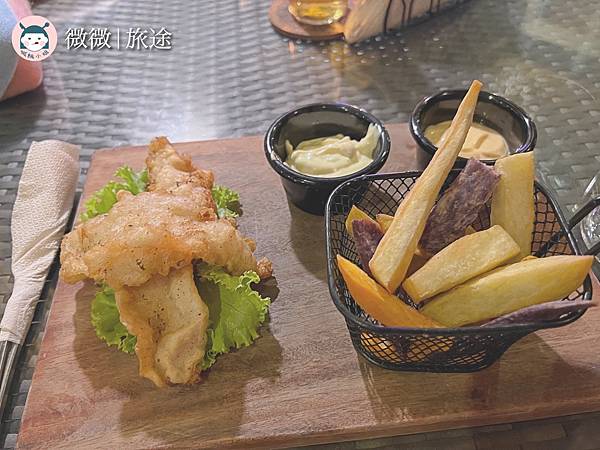 <Fish n' Chips炸魚薯條>個人蠻驚訝可以吃到這道炸魚薯條,外面炸得酥酥脆脆,裡頭的魚鮮嫩多汁,沒有奇怪的腥味,薯條部分是有地瓜跟馬鈴薯和芋頭組成。