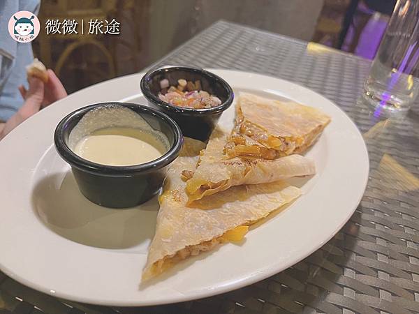 <Chichekn Quesadilla 墨西哥雞肉餅>雞肉烤餅裡頭有起司,味道蠻夠味的附上甜甜的美乃滋沾醬。