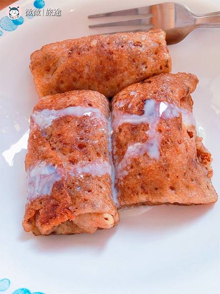 因為布林餅其實都會包內餡一起食用,所以一般上桌時,其實都不會看到圓圓一大片的布林餅,反而是捲成這樣抱內餡的,內餡的口味比較特別的是包奶渣,個人其實蠻喜歡的,奶渣算是俄國常見的奶製品之一,吃起來有一種乾掉優酪乳渣渣的味道,還會淋上煉乳一起吃,其實飽足感非常夠,就可以當一餐囉,推薦大家可以試試![]()