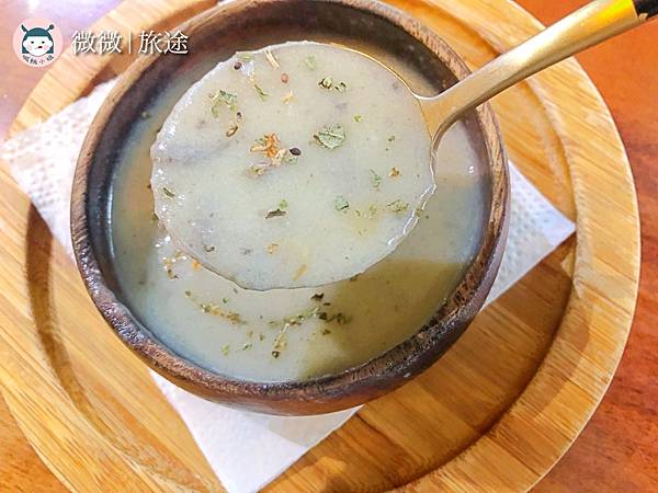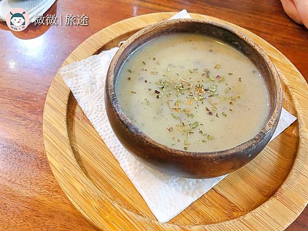<今日湯>只要20元就可以加購小份湯,有一點奶油蘑菇馬鈴薯濃湯,還不錯喝,對女生份量來說剛好,可以嚐到熱湯,又不會有喝完湯就吃不下餐點得窘境。