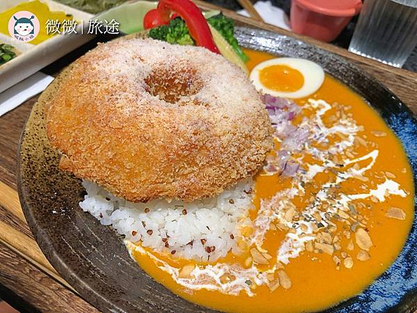 <泰式花生醬咖哩+起司雞肉甜甜圈>看到這個菜名實在很難不點甜甜圈,外型真的很像現炸熱騰騰出爐的甜甜圈