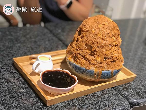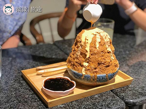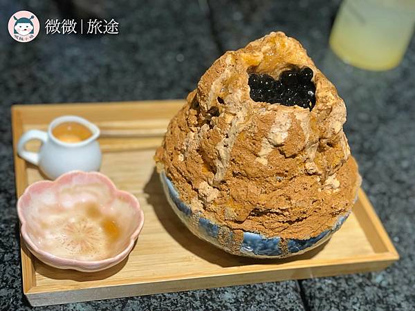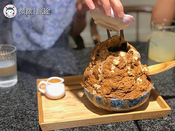 吃起來刨冰有濃濃的茶味,最下方還有布丁,口味比較甜,大家可以分著吃!