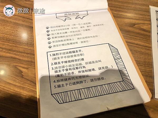 在菜單的第一頁還有寫上用餐須知,還有一些跟貓咪相處的小規則,大家都要乖乖遵守哦![]()