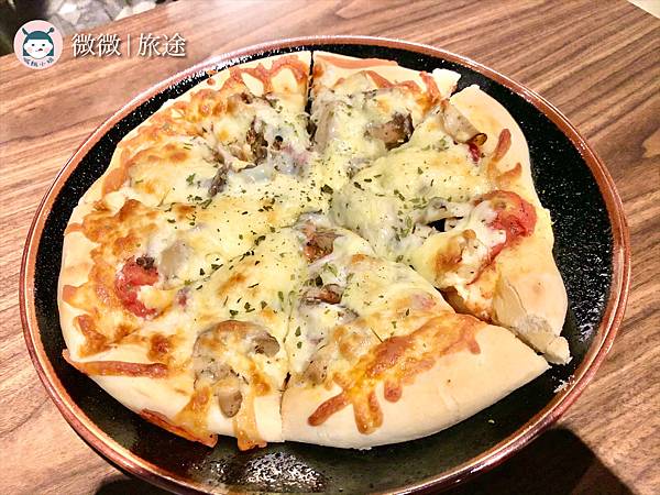 <綜合野菇披薩>有一點像佛卡夏麵包的外皮,吃起來外頭酥酥的裡頭很鬆軟,滿滿的起司,味道剛好不會太鹹