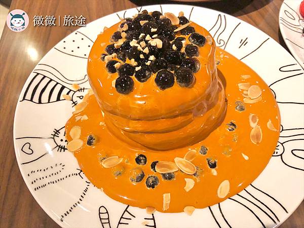 <泰奶珍珠舒芙蕾鬆餅>這個ㄉㄨㄞ ㄉㄨㄞ 的鬆餅,讓人忍不住就想咬一口,切開來是綿密的舒芙蕾,一口沾泰奶醬香香的茶味加上彈牙的珍珠,好吃![]()