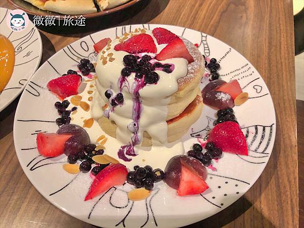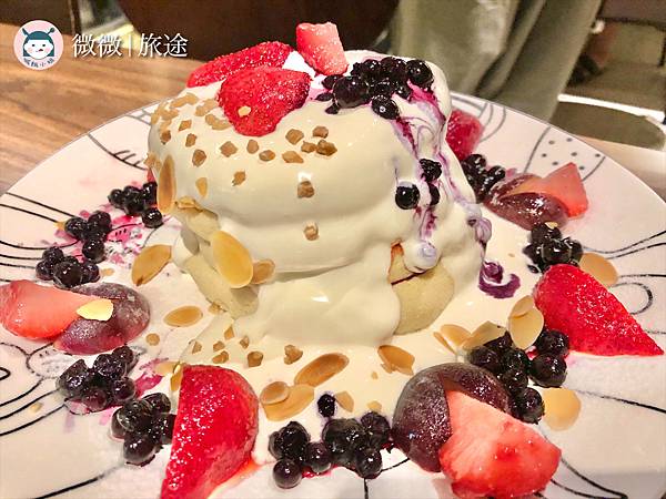 <綜合莓果舒芙蕾鬆餅>鮮奶油醬配上各式莓果,吃起來酸酸甜甜,是女生最喜歡的口味,酸綜合了甜味,不會膩