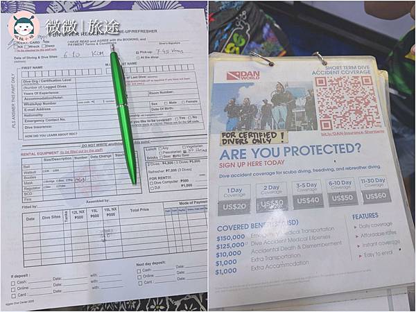 資料填寫好後,他們有保險可以加購,我們就上網額外買了加購!忘了拍試裝備的地方給大家看,填完資料跟付款後,就會有人帶我們開始試裝備BCD、蛙鞋跟配重,也有兩個更衣間,可以試防寒衣哦!我們有自己的面鏡,就沒有借他們的了,忘了說,你少借裝備是不會減價的囉,他們會籃子打包好,寫上你的名字,明天在船上就會看到啦!接著就開開心心等待要出去潛水啦~