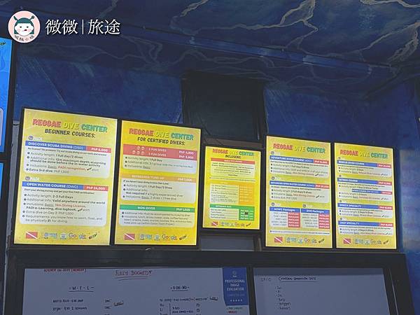 旁邊有座位區,可以來填寫資料囉!我們選的是一整天的Fun dives三潛「5800」披索,已經含裝備、午餐、小點心跟咖啡、飯店接(送只送回潛店)了,只有電腦錶要另外借是500披索/天。這家店明確說明最多教練是一帶三個人哦。