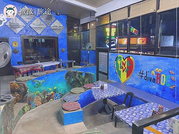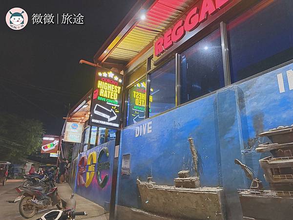 店家位於主要熱鬧大街不遠處,裝潢得很繽紛有趣,我們在抵達當天去了三間潛店逛逛分別是「Reggae Dive Center」、「Corto Divers」和「Pirates Diving Center」,主要是跟他們聊聊確認一下潛點、船的設施(ex:有沒有簡易廁所),還有感受一下店家的信賴程度。Corto Divers解釋得很認真,有把每一個沈船的地點都跟我們講解一遍,也有給我們看一下照片,跟目前這幾天有開的潛水行程,可以幫我們安排三天看完全部的沉船。Pirates Diving Center潛店很小,跟和教練聊起來感覺不太適合,最後選擇了「Reggae Dive Center」就讓我來說說為什麼吧~