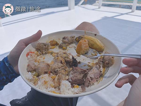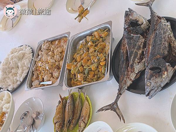 菜色就是菲律賓式的料理,不能要求太多~他們有一道是素食的,讓素食的人先盛飯~我們吃完居然才是教練們用餐,真的很怕他們沒吃飽,等等沒力氣帶我們下水![]()