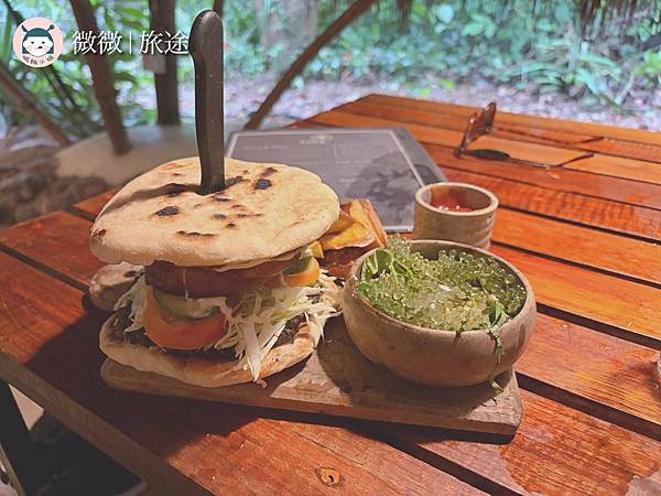 <Mountian mains-Buger Bum漢堡>這道漢堡是老闆娘推薦的,連麵包餅皮都是自己製作的,吃起來可以感受到滿滿的蔬菜健康感,裡頭最特別的不是肉排,而是用香蕉花炸過後,吃起來很特別,旁邊還有附上沙拉上面有海葡萄哦!旁邊有附上炸地瓜薯條~吃起來飽足感還蠻夠的!推薦大家可以試試看,應該是沒吃過的料理方式~