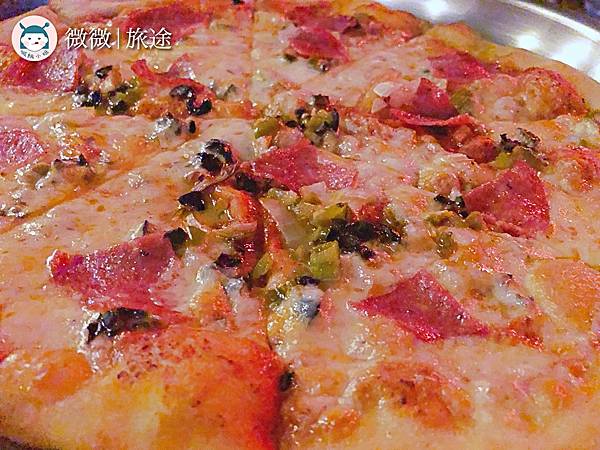 <披薩-墨西哥辣妹>口味不會到太辣,非常喜歡這種窯烤披薩,皮薄烤得脆脆的,咬下去邊邊還會想餅乾一樣脆口,起司很香,上頭有切丁綠色的墨西哥辣椒,不會太辣哦!