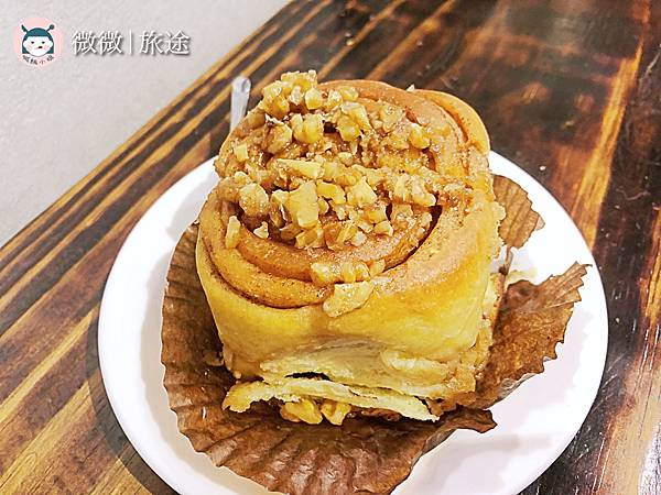 <肉桂卷>不是那種灑滿糖霜超甜的肉桂卷,是那種淡淡肉桂香,上頭灑上堅果,吃起來不會膩