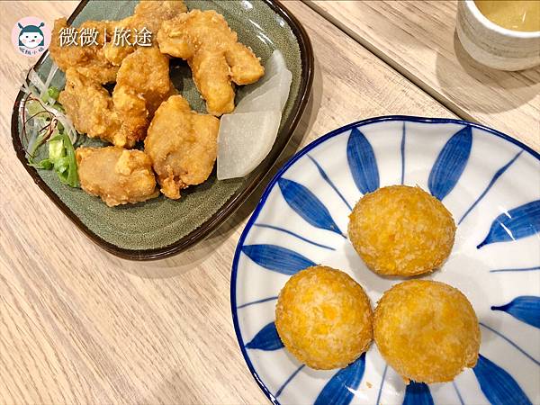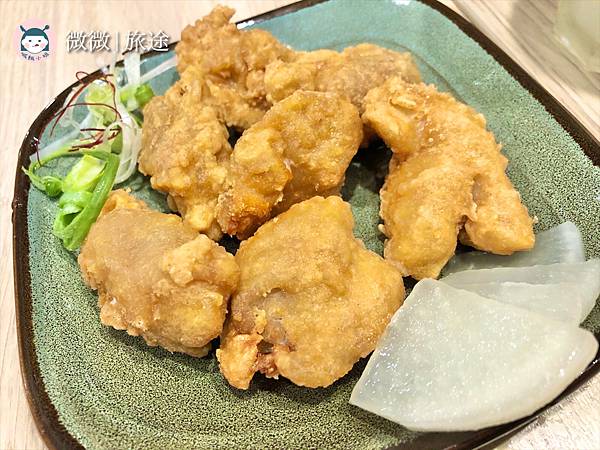 <唐揚炸雞塊>雞塊很嫩,炸皮不會像鹽酥雞那種刮嘴,配上醃製的白蘿蔔,剛好解膩