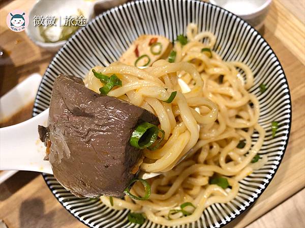 麵是用細麵,吃起來Q彈,並不會很辣,只是微辣香香的,還有附上鴨血跟豆腐,上頭撒上蔥花。