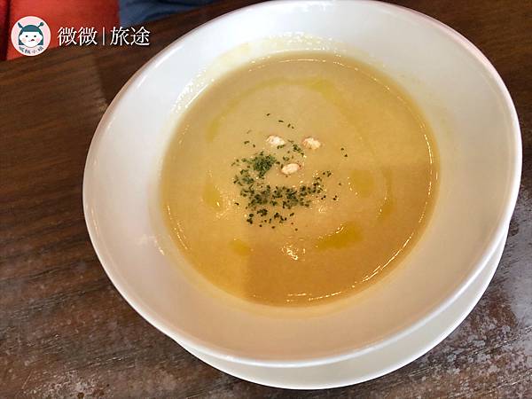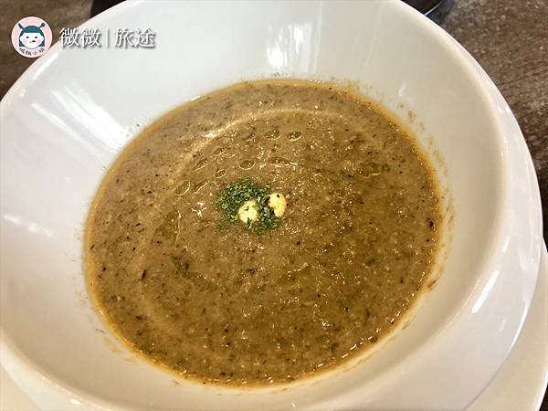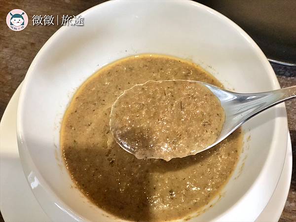 <牛肝菌蕈菇濃湯>相當濃稠,沒有帶奶味,而是濃濃菇味的湯頭哦