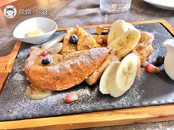 <莓果楓糖法式吐司> 吐司的製作比較像吸滿牛奶後下去煎的法式吐司,咬下去吐司帶點濕度,外頭煎的微焦香,配上帶酸的莓果點綴口味,還不錯吃囉