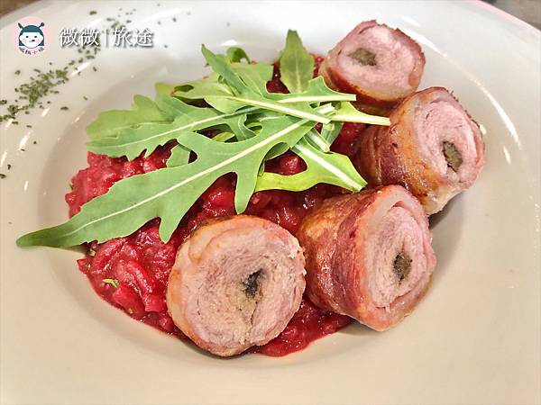 <燉飯-波特豬甜菜根>在台灣算是很少會吃到甜菜根類的料理,調理的口味偏甜,帶點番茄味,特製的豬肉捲外頭包上培根,很特別哦