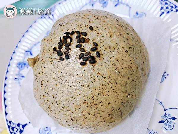 <黑芝麻紅豆包>這款是甜的口味,裡投滿滿的紅豆泥,還有吃的到顆粒,外皮的芝麻味並不會太搶,吃起來不膩哦