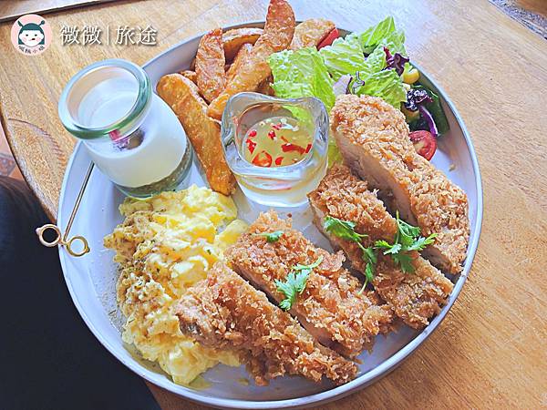 <香草雞大平台>我點的是早餐拼盤,有沙拉、炒蛋、薯條和麵包,雞肉煎的焦脆,還不錯吃哦