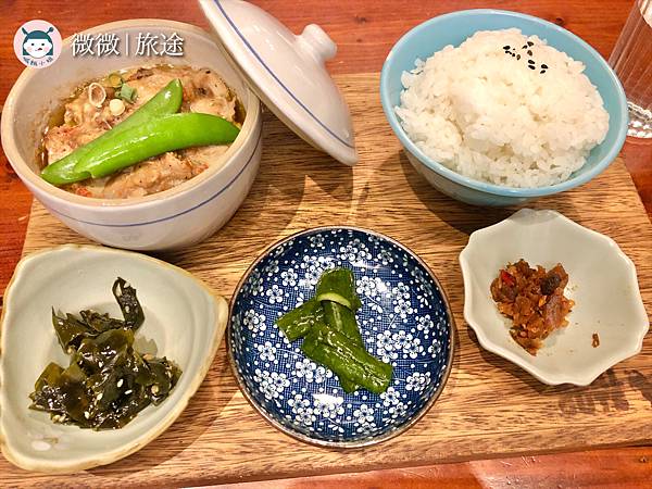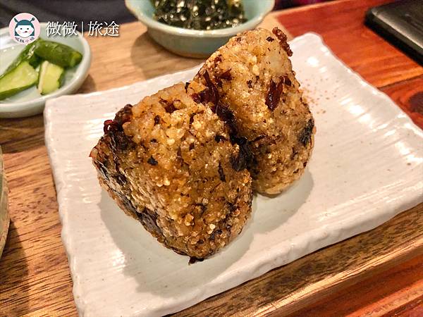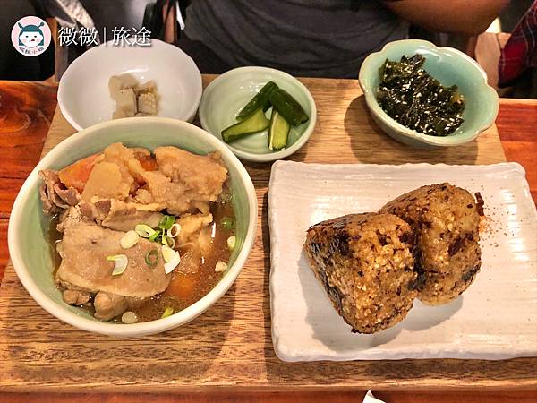 <現烤手捏黑糖柴魚飯糰>烤飯糰配上馬鈴薯燉肉,附上小菜