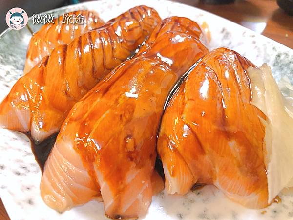 <鮭魚握壽司>接著就是這個超級重頭戲,這家店的超級招牌,一定要必吃必點的巨無霸鮭魚握壽司