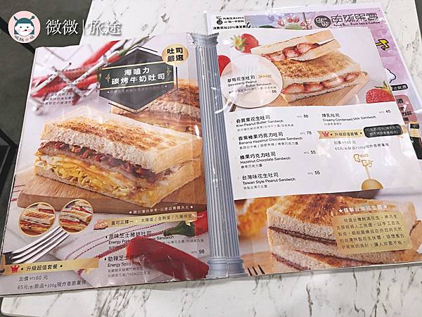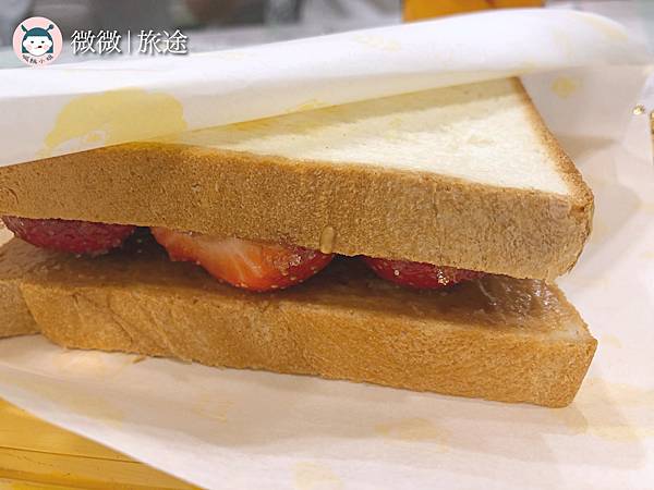 <草莓花生吐司>這個看菜單裡超級迷人,忍不住就點了,但上桌跟我們想的有一點不一樣,吐司的外皮沒有烤得酥脆焦香,還有很多沒烤的地方,不得不說草莓跟花生真的不太搭,我們吃起來覺得有點奇怪,最後是拆開來單吃草莓,再單吃花生吐司
