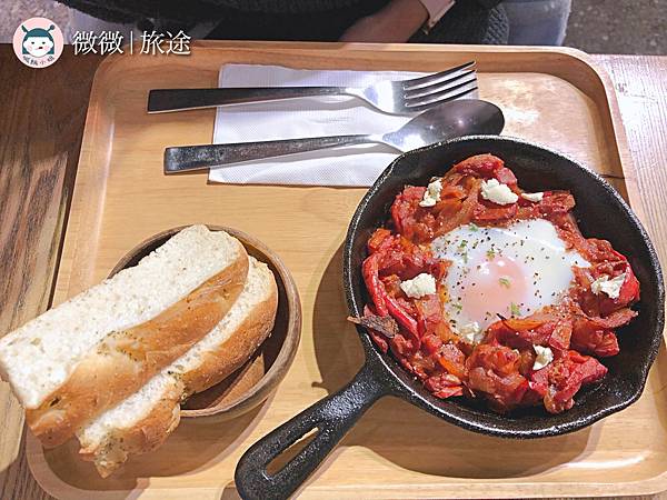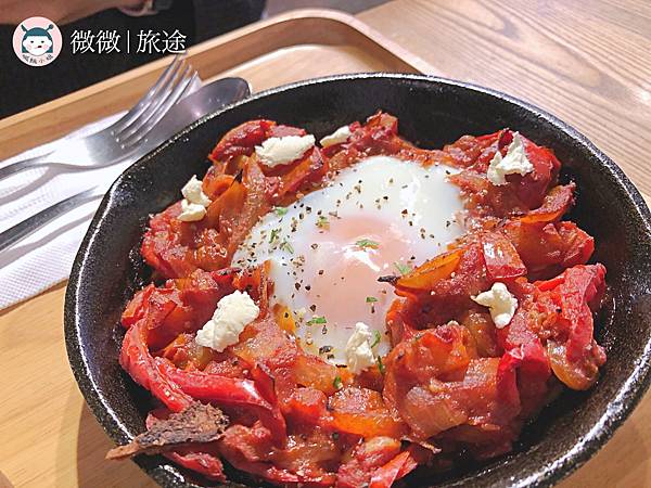 <紅色番茄香料慢熟蛋>個人其實一直都蠻喜歡吃風乾番茄的,這個番茄加入培根和香料下去拌炒,上面再放上半熟蛋,配附餐的佛卡夏很適合哦