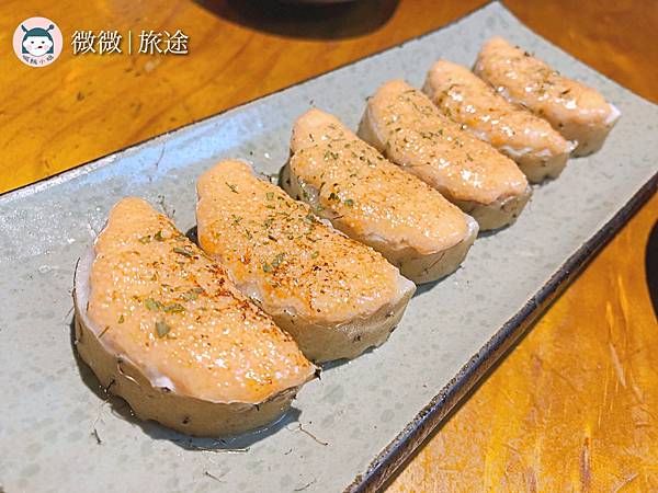 <明太子山藥>這倒是我自己私心推薦大家必點,自己每次去居酒屋都會點這道,但這個山藥還保有脆度外,上頭的明太子醬還有濕潤的口感,好吃