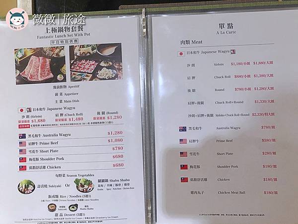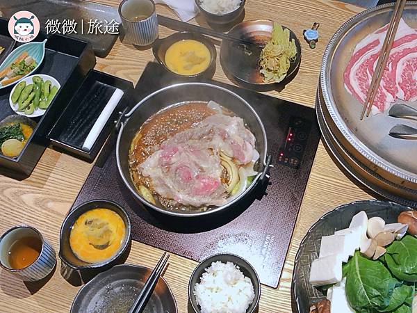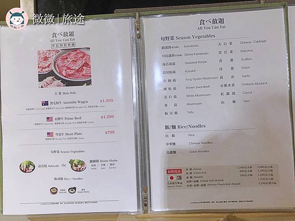店家有分鍋物和壽喜燒兩種,我們點的是壽喜燒吃到飽,也依照肉的不同價格不同,我們點的是雪花牛的價格,大家要留意平日跟假日的吃到飽價格不一樣,菜單都寫得蠻清楚的,可以參考看看囉~