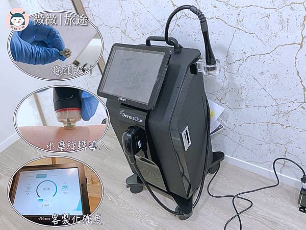 可以看到這台由君綺診所最新引進的機器 「黑鑽水飛梭」,吸力探頭設計到水磨旋轉式導入精華液,美容師也會針對每個人不同的膚況,做不同客製化強度的調整。