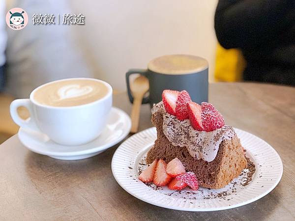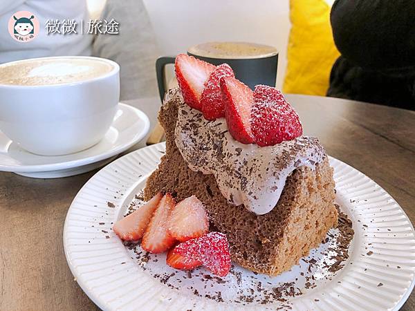 <草莓巧克力戚風>點了當日限定的品項,是很鬆軟空氣感的戚風蛋糕,不是那種偏甜的,是帶有一點巧克力香氣的蛋糕體,但個人覺得草莓跟戚風蛋糕有點分開,草莓像點綴而已
