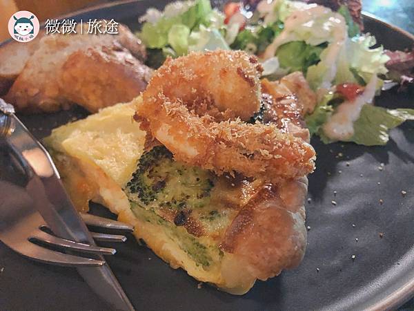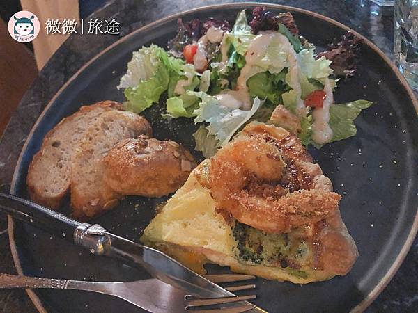 <滑蛋鮮蝦鹹派>個人覺得鹹派的部分有一點點鬆散,派皮沒有酥脆跟內餡有一點點薄弱,表現有一點點普普
