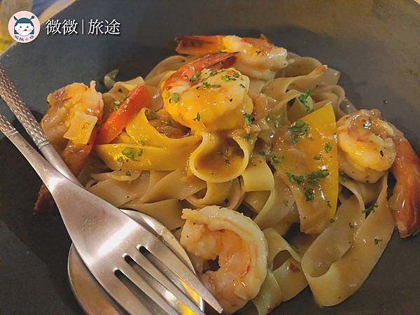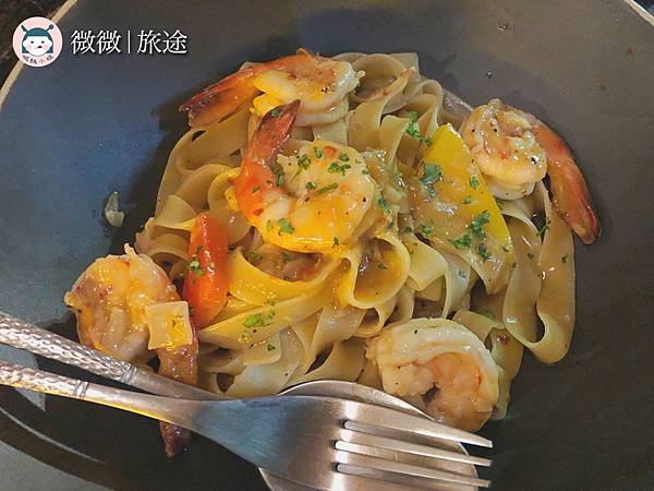 <鮮蝦鳥巢麵佐主廚自製蝦醬>麵條很Q,自製的蝦醬有一點像台式XO醬的口感,還蠻ㄙㄨㄚˋ嘴的