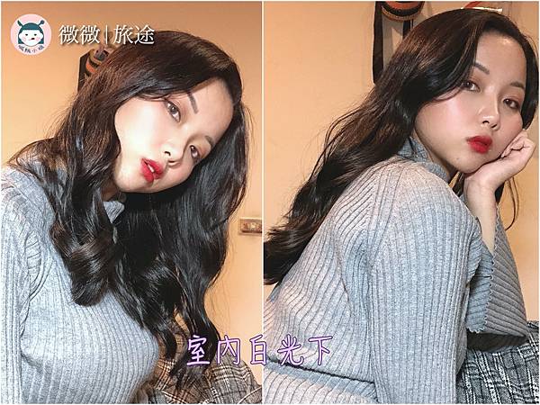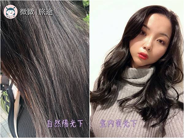 大家可以看到在不同光源下,自然光下霧面的頭髮質感比較明顯,剛染完的室內黃光下則是偏黑,隔天染完頭髮,戴口罩路上同事認不出來,想說這個女子是誰,怎麼變那麼漂亮,內心暗爽都要裝不好意思了![]()