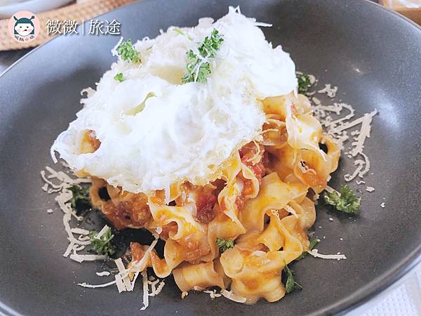 <月桂葉波隆那肉醬刀削麵>自己超級喜歡吃寬麵的,刀削麵的口感吃起來比較有嚼勁,上面還有荷包蛋裝飾,撒上起司,很不錯哦