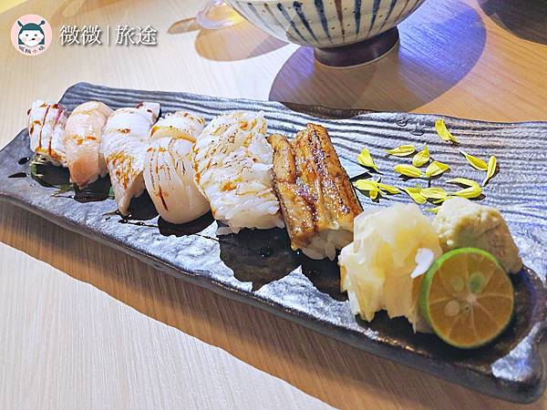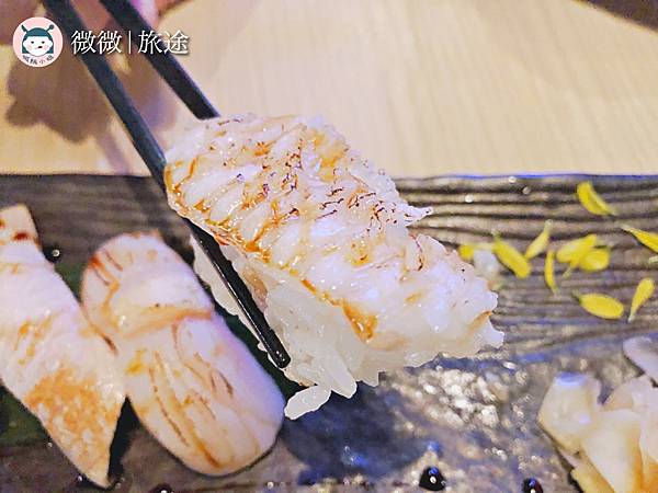 <綜合炙燒握壽司中盛>總共有六個不同品項的魚類,覺得炙燒得剛好,比目魚入口還能吃到一點點油花焦香