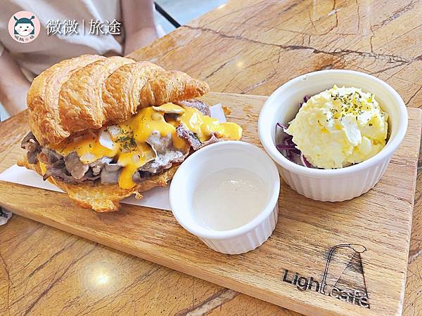 <費城牛肉可頌>看到這個融化的起司,口水都要吞好幾次了,可頌的外皮烤的酥酥脆脆,咬下去裡頭還有點鬆軟,旁邊有附上蛋沙拉
