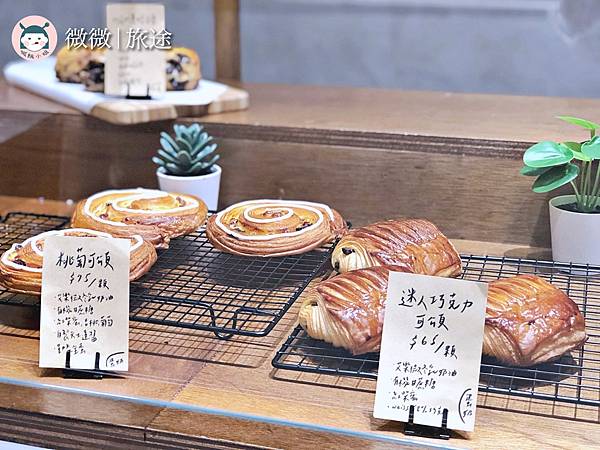 麵包的品項還蠻多元的,甜的鹹的都有。櫥窗每個看起來都好誘人,可頌看起來也好好吃~