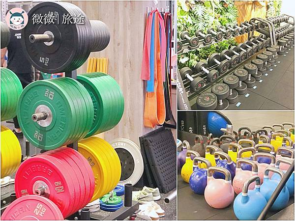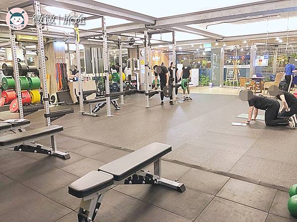總共有兩層樓,一進門一樓的部分有休息座椅區和自主訓練自由重量區,大部分人都會在一樓做暖身和肌肉放鬆的動作。