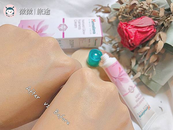 可以看到左右手使用前後的差異。裡面的成分大多是植物維生素精華。最特別的是如同品名裡頭有添加番紅花精華的成分,對於提亮很有幫助。