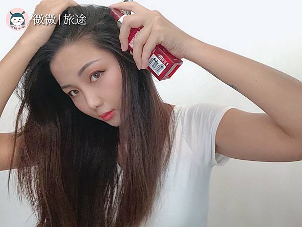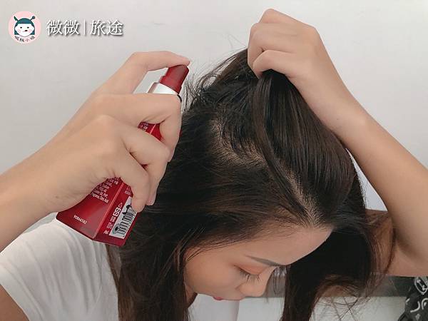 同一區塊只要噴一到兩次,噴的時候可以邊撥鬆頭髮,更均勻分布。噴出來的是液體水狀的,因為這款是採用水基底配方,用噴灑是的可以更均勻不結塊。