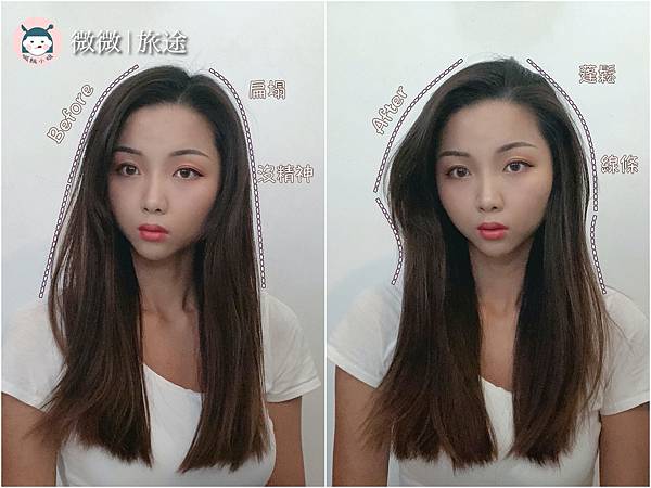 可以看到明顯的對比,整個線條的頭髮都跑出來了,原本扁塌的部分,都呈現蓬鬆感。個人很喜歡這款的味道,超級適合夏日有點檸檬草的清香,是讓人很舒服討喜的味道。相信很多女孩跟我一樣,明明洗完頭隔天早上起床,頭髮又很貼,加上悶熱的天氣,看起來超級不清爽,這種完全是針對這種困擾,使用上也很簡單「一噴一吹髮根」,就可以撐起髮根。有用過一些乾洗髮噴出來是直接粉霧狀,有時候控制不好,就會白白的一塊,本來想偷懶都要趕快去沖頭,這種水狀的設計,不會讓你有失手的危機。看起來蓬鬆但不會毛躁,摸起來會有霧面的粉質感,但不會乾澀,先說哦!是你平常頭髮就要護髮,不要怪到人家頭上來~![]()