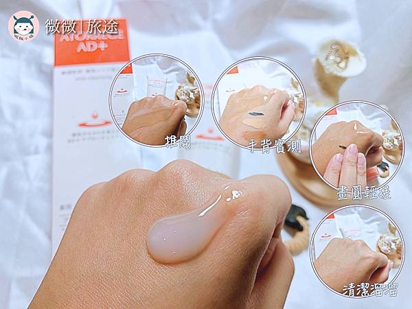 馬上來上手背試用看看,凝膠擠出來是透明白色狀,沒有奇怪的異味,推開有點帶水狀~拿出我夏日用的眼線液筆、遮瑕膏、染眉膏,絕對是大魔王!不需要沾水,先在手上加溫慢慢畫圓,居然十到十五秒,彩妝就陸續被卸除了!最後用溫水清洗,清潔溜溜囉~![]()