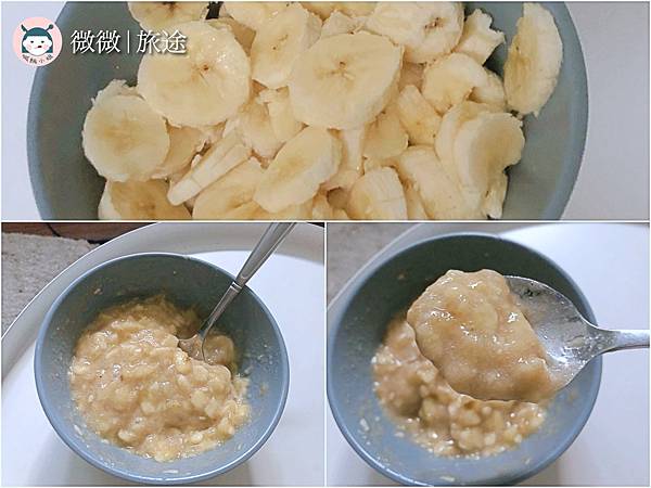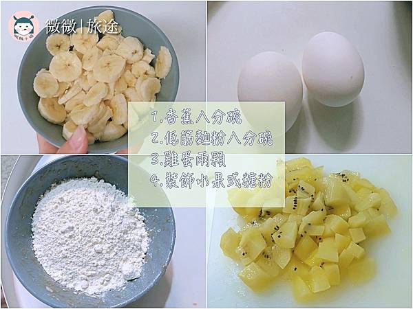 材料很簡單,原則以香蕉跟麵粉1:1的比例,我用的碗是中型左右的碗: