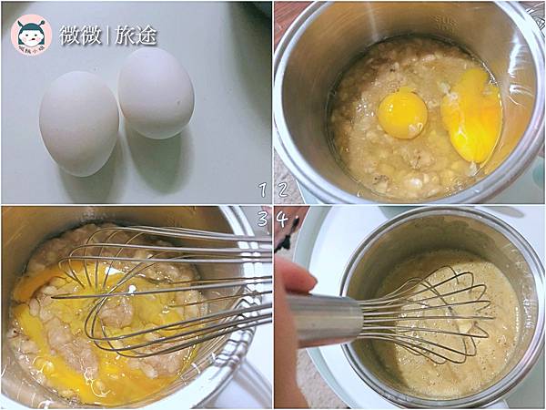 接著將兩顆雞蛋加入香蕉泥裡,使用打蛋器攪拌,這個動作要仔細攪拌,主要是要將空氣打進去,讓吃起來的口感更鬆軟哦!