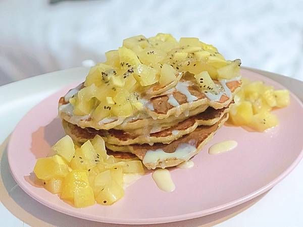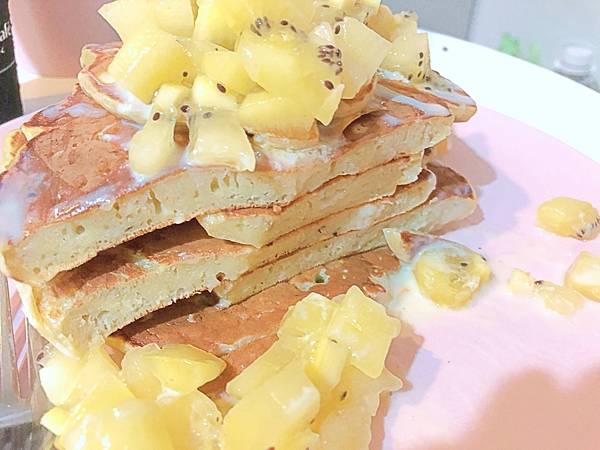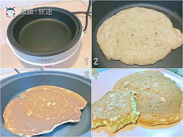 接著再放入平底鍋或租屋常用的小煎鍋,放到鍋子內,只要看著麵糊起泡泡,就可以翻面囉~絕對不要壓它,會讓空氣被擠出去,就不鬆軟囉~可以看到完全就是美式煎餅的顏色~等不及要開動了![]()